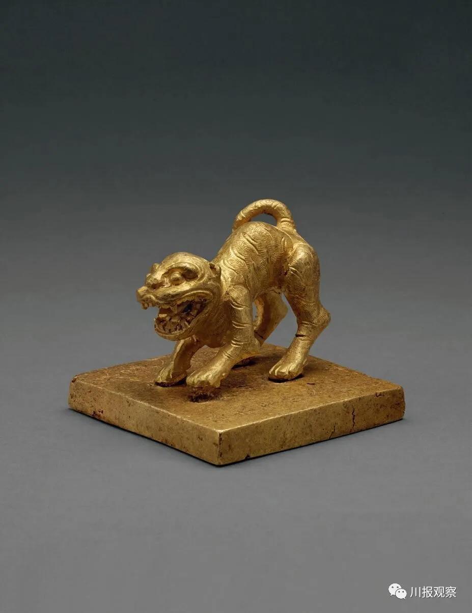 印钮为一立虎的形象,虎口大张,虎身前倾,虎尾向上卷曲,虎身阴刻线纹表现虎的鬃毛和斑纹。专家分析认为,此枚金印极有可能是张献忠本人之印。