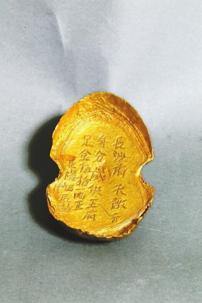 “长沙府”,即当时湖南行政区划,省治所在地,“吏杨旭”应为监铸官,“匠赵”则为熔铸此枚金锭的金匠。长沙是明王朝的一个藩封重地。藩王每年的俸禄全部出自地方财政。这应是长沙府向吉王府岁供的一种特型的金锭。1643年,张献忠亲率大西军进军湖南,同年长沙陷落。金锭当属张献忠在大肆搜罗的战果之一。