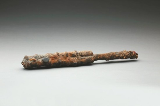 这件文物尽管泡于江水中数百年,已经锈迹斑斑,当年却是威力巨大的火器。既可以远距离射杀敌人,也可近战砸击。它的出水,为佐证江口遗址为战场遗址性质提供了更充分的证据,并且印证了文献中战争曾采用了火器进攻的记载。