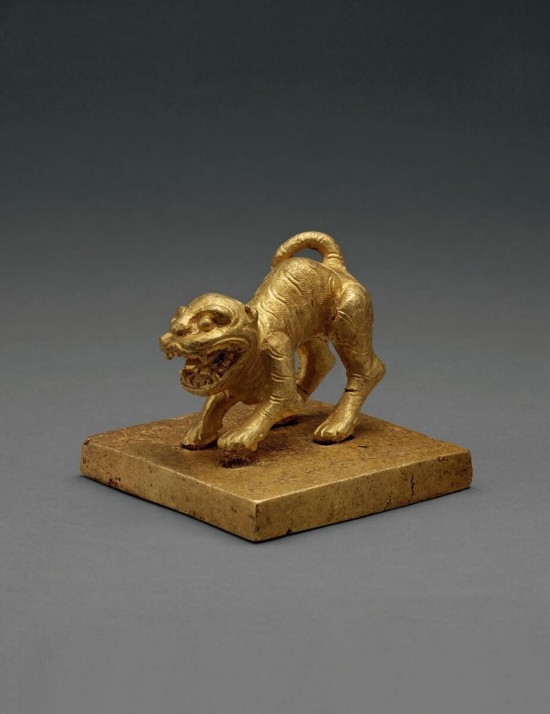 印钮为一立虎的形象,虎口大张,虎身前倾,虎尾向上卷曲,虎身阴刻线纹表现虎的鬃毛和斑纹。专家分析认为,此枚金印极有可能是张献忠本人之印。