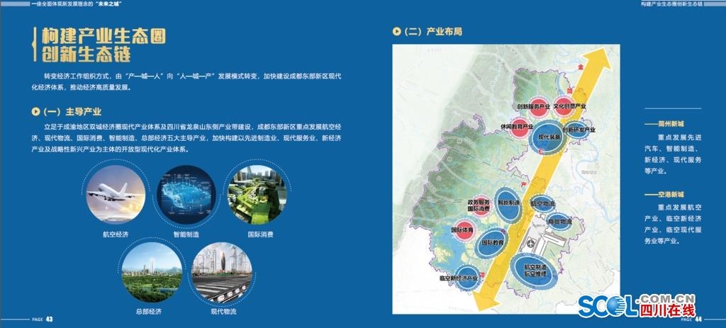 ——简州新城:集聚创新研发、智能制造、商务办公、特色文创功能,建设以成都东部新区铁路枢纽站为核心的成渝地区双城经济圈开放创新服务平台,以新经济为引领的商业商务、生活服务、文化教育中心,以先进汽车产业为支撑的现代制造基地。