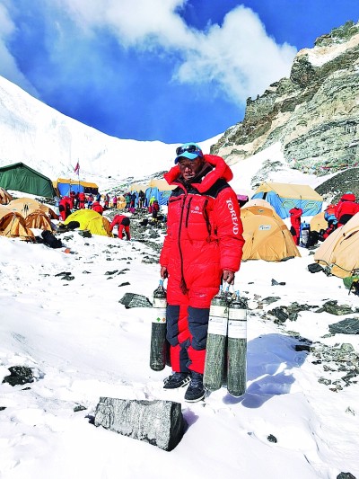 5月8日,在海拔6500米的前进营地,登山向导正在准备运往海拔7028米营地的氧气。新华社发