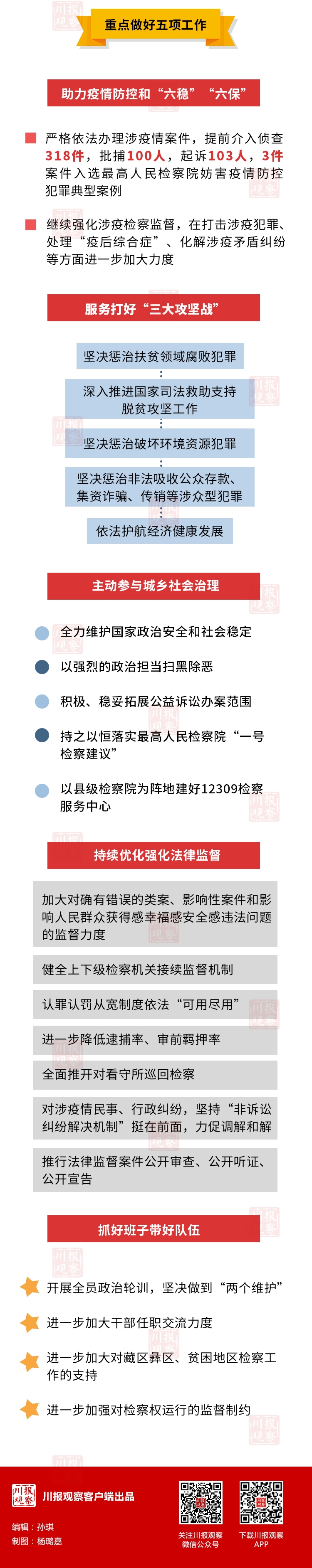 围绕中心工作,践行初心使命;更新监督理念,做到客观公正;推进“四大检察”,落实为民司法;保护教育管束,护航未成年人成长;深化改革创新,提升队伍素能;主动检务公开,自觉接受监督……报告从六个方面梳理了去年四川检察工作的重点和亮点。这些检察工作给四川经济社会发展提供了怎样的法治保障?给四川百姓带来了哪些法治福利?
