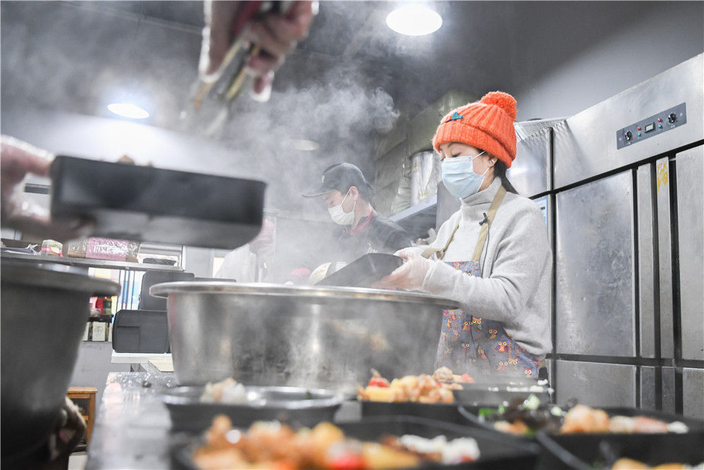 2月26日,爱心人士“雨衣妹妹”(右)在分装盒饭。新华社记者 程敏 摄