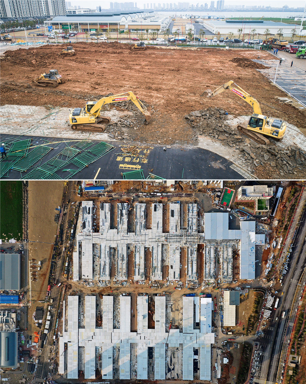 拼版照片:上图是1月26日拍摄的武汉雷神山医院建设工地(无人机照片,新华社记者肖艺九摄);下图是2月5日拍摄的武汉雷神山医院建设工地(无人机照片,新华社记者李贺摄)。经过十昼夜的奋战,2月6日,雷神山医院正式通过武汉市城建和卫健部门的验收,并开始逐步移交。新华社发