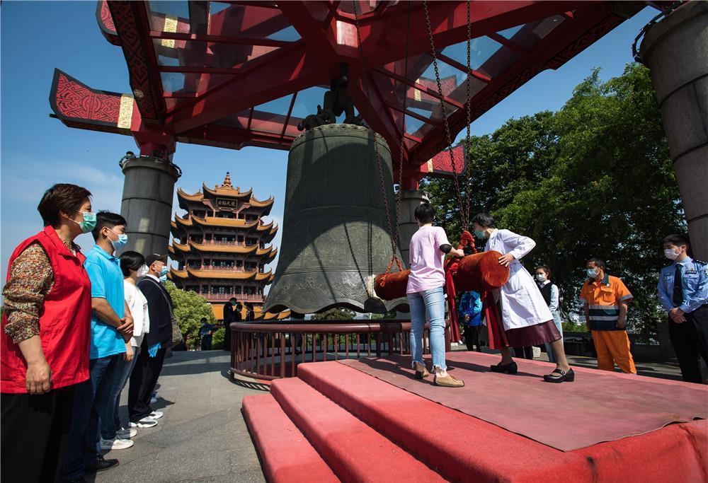 4月29日,武汉黄鹤楼景区重新开放,这是抗疫一线代表在武汉黄鹤楼景区重新开放仪式上撞钟祈福。新华社记者 肖艺九 摄