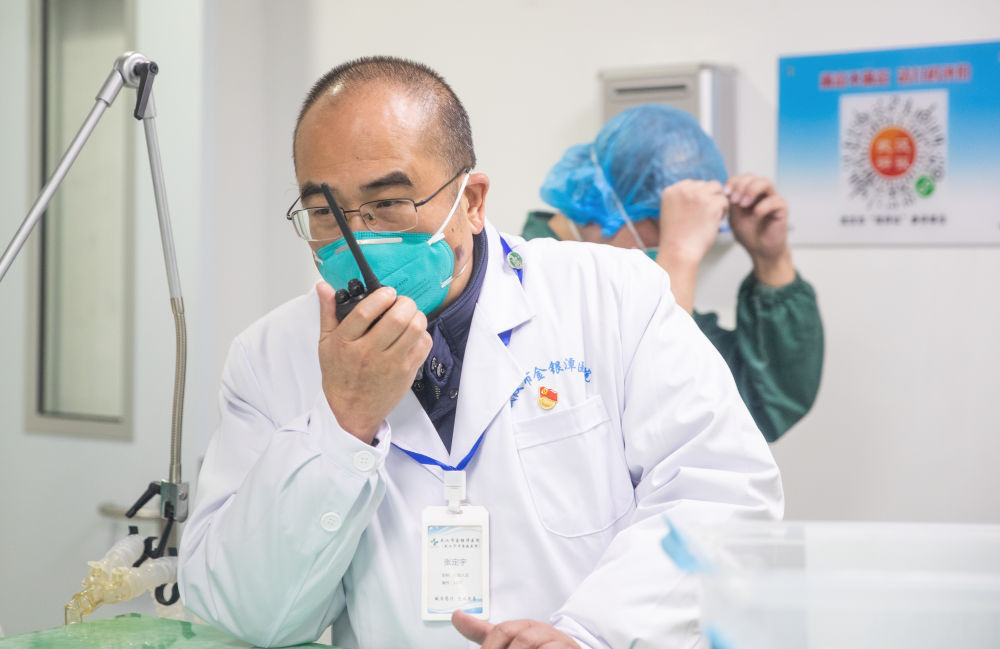1月27日,在武汉金银潭医院综合病区楼,张定宇在联系协调工作。新华社发(柯皓 摄)