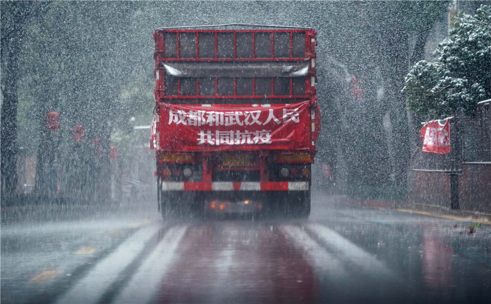 2月15日,运送成都市成华区捐赠武汉消毒液的卡车在武汉市区行驶。新华社记者 王毓国 摄