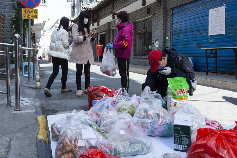 3月15日,湖北省襄阳市水星台社区党委书记刘晓琳(右二)和社区工作人员在查看、分发居民从网上订购的生活用品。新华社发(谢剑飞 摄)