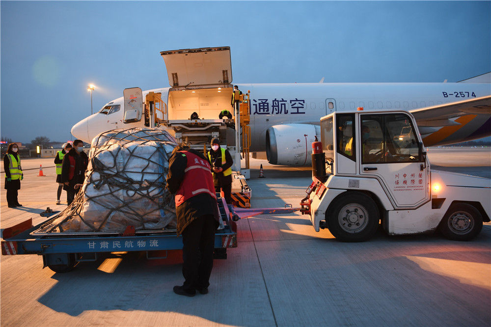 2月19日,在兰州中川国际机场,机场货运工作人员往飞机上装运运往武汉的防疫物资。新华社记者 范培珅 摄