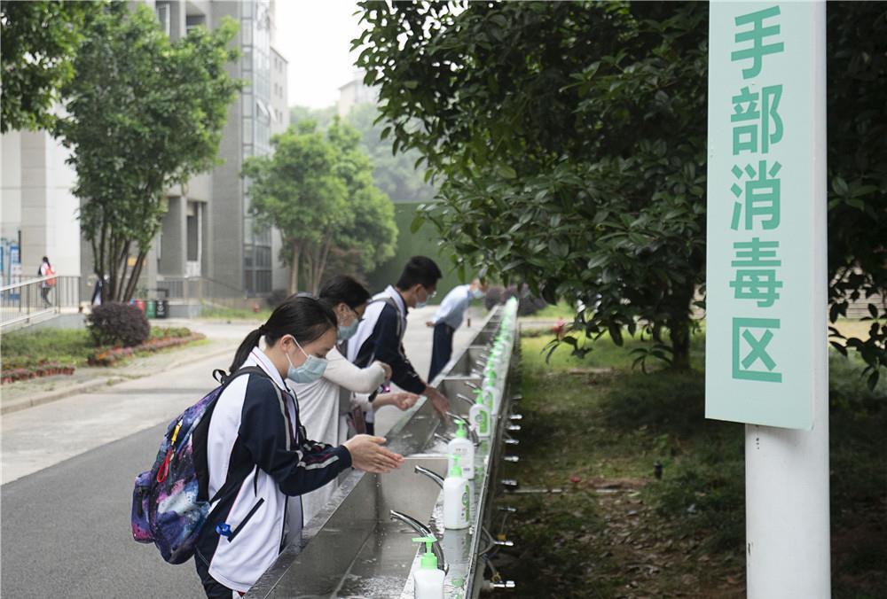 5月6日,武汉首批121所学校高三年级正式复学。在湖北省武昌实验中学,高三年级的学生入校后在手部消毒区洗手。新华社记者 熊琦 摄