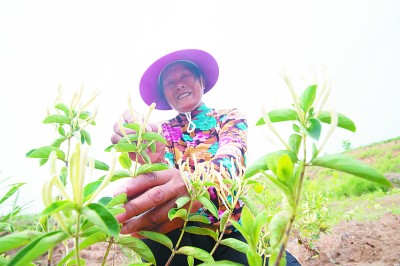 江西省九江市湖口县大力发展特色农业、品牌农业、智慧农业,形成“一乡一业”“一乡一园”“一村一品”现代农业新格局,带动村级集体经济发展壮大,助力脱贫攻坚。图为湖口县均桥镇文光村的农户在金银花花田里采收花骨朵。张玉摄/光明图片