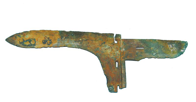 在新川红花沟,珍贵的“郫”字青铜戈在编号358的一处战国晚期岩坑墓中被发现。青铜戈锈蚀严重,但保存完整。戈的一端,篆刻了一个清晰的“郫”字,由此成为目前考古发现的郫县得名最早实物资料。