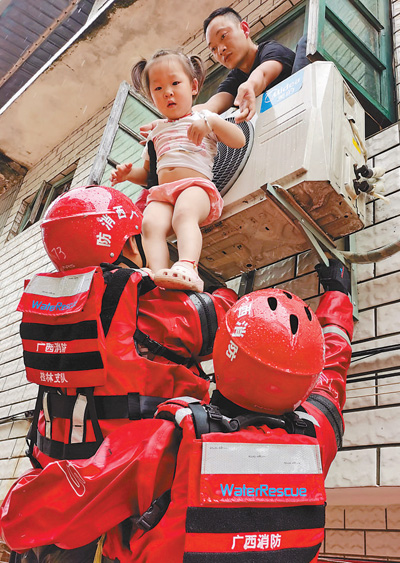 7日,在广西永福县永福镇茅江桥一带,消防救援人员架设人梯,从二楼窗户紧急营救被洪水围困的群众。丁怡婷 潘 杰摄影报道