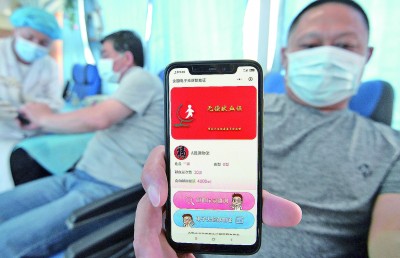 6月14日,国家卫生健康委宣布全国电子无偿献血证正式启用,献血证“安家”互联网。从6月14日开始,全国各地无偿献血者都可以通过国家卫生健康委官网、中国政府网、国家政务服务平台和支付宝、微信、百度小程序一键查看本人的电子无偿献血证和全国无偿献血量。图为河北省邯郸市一采血车上,一名献血志愿者展示手机里的电子无偿献血证。郝群英摄/光明图片
