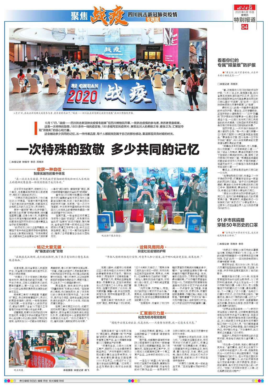 6月17日,“战疫——四川抗击新冠肺炎疫情专题展”在四川博物院开幕,一批抗击疫情的参与者、亲历者受邀观展。这是一次特殊的致敬。1800余件一线抗疫实物,180余幅写实抗疫照片,展现出川人的勇毅之举、奋发之为,汇聚起夺取“双胜利”的信心和力量。