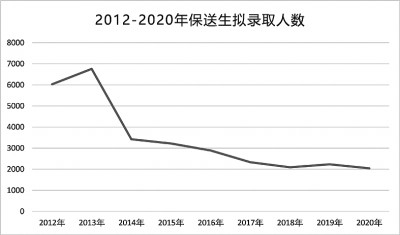 保送生方面,自2014年起,保送生人数开始大幅缩减,从每年拟录取6000余人,下降至2000人左右。2020年,全国仅有51所院校拟录取保送生2042人,为历年来最低。教育部规定,2017年秋季及以后进入高中阶段一年级的学生,获得“省级优秀学生”称号的不再具有保送资格条件。这也就意味着,2020年起,保送生招生取消对获得“省级优秀学生”称号的保送资格条件。目前,仅有四类学生仍具备高校保送生资格:中学生学科奥林匹克竞赛国家集训队成员、部分外国语中学推荐优秀学生、公安英烈子女、退役运动员。