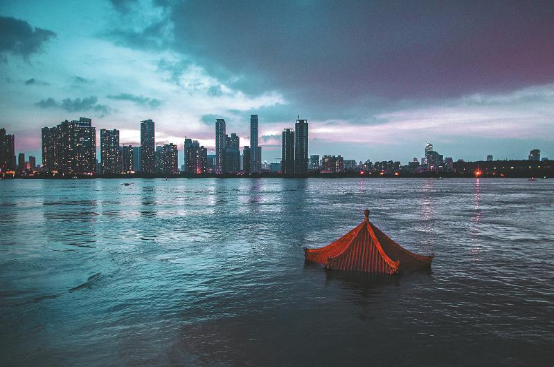 7月13日,上涨的江水即将淹没武昌黄花矶凉亭。 新华社记者 肖艺九 摄