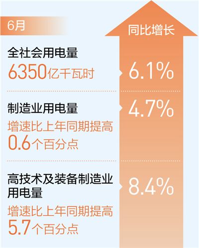 6月全社会用电量同比增6.1% 高技术及装备制造业同比增8.4%