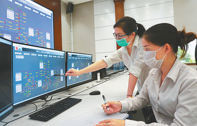 在老挝南欧江梯级水电站集控中心,中老两国员工监测发电站设备运行,进行电力和水情管理。人民日报记者 孙广勇摄