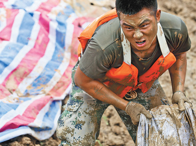 21日,安徽巢湖水位不断上涨,陆军炮兵防空兵学院学员搬运沙袋加固大堤。邹德勇摄(影像中国)