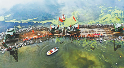 21日,长江大堤安徽无为水家楼段,武警官兵经96小时奋战,在洪水中筑起一条400米长的防洪子堤。本报记者 陈 斌摄