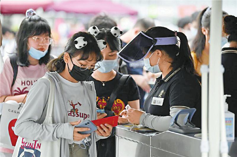 7月20日,成都大熊猫繁育研究基地,来自全国各地的游客戴上口罩有序排队,陆续进园。 李向雨 摄