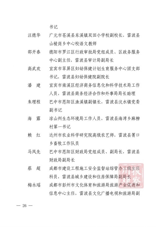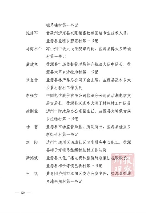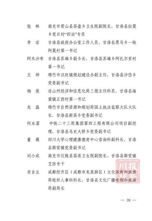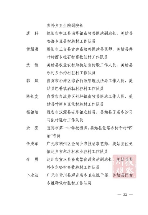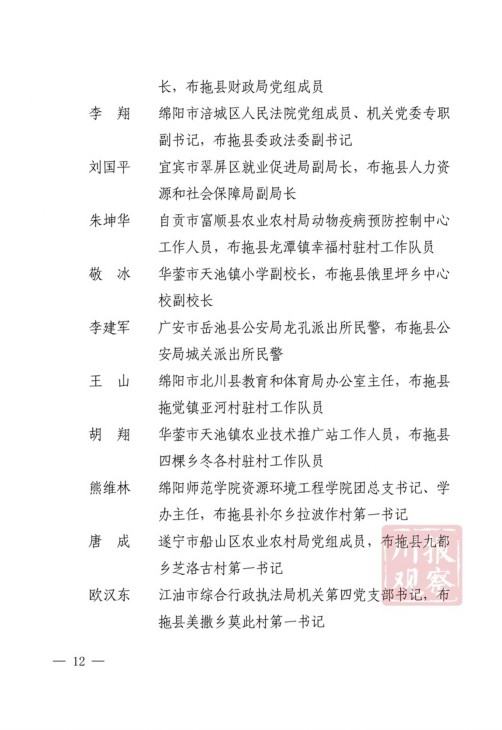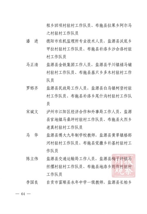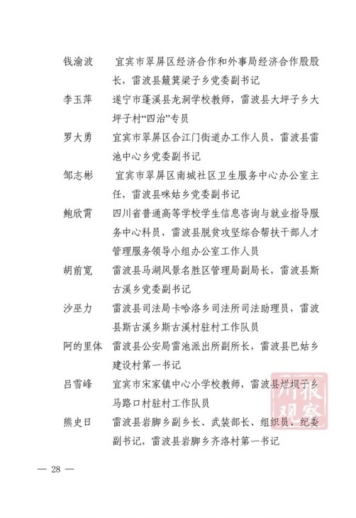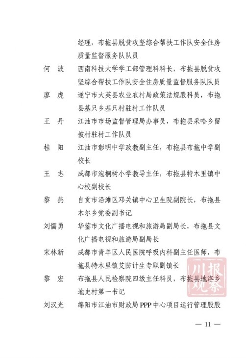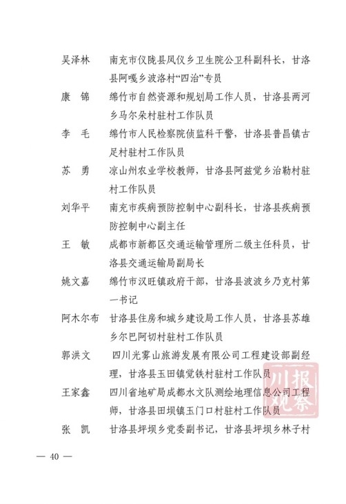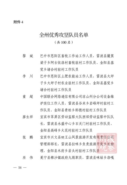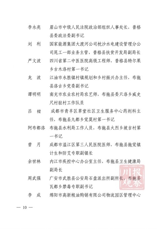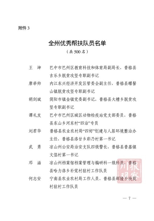 四川在线消息(记者 何勤华 凉山观察 杨正飞)7月28日上午,凉山州脱贫攻坚帮扶干部人才表扬大会举行,凉山州委、州政府决定,对普格县荞窝镇云盘山村等10个“十佳综合帮扶工作队”,刘维等10名”十佳帮扶队员”,王坤等500名“优秀帮扶队员”,黎斌等100名“优秀攻坚队员”,王祖兴等50名“优秀驻村工作队员”予以通报表扬。