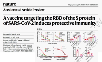 2020年7月29日,四川大学华西医院生物治疗国家重点实验室作为第一作者单位和通讯作者单位,在Nature 在线发表题为“A vaccine targeting the RBD of the S protein of SARS-CoV-2 induces protective immunity”的研究论文,该论文的通讯作者是魏霞蔚研究员、逯光文教授与张康教授,第一作者是杨静云博士、王玮教授以及杨自敏博士等,这也是Nature杂志发表的第一篇新冠疫苗研究论文。