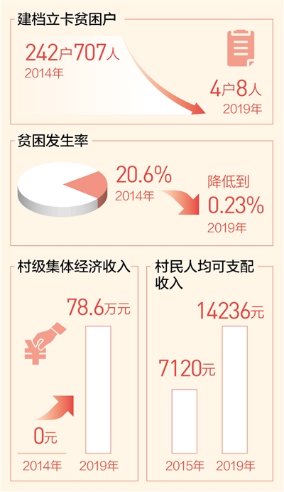 2014年,全村建档立卡贫困户242户707人,贫困发生率20.6%。到2019年底,仅剩4户8人的脱贫任务,贫困发生率降至0.23%。