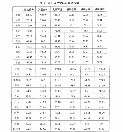 成都的民营经济发展指数为83.46,排第一位,达州(72.14)、绵阳(70.97)列第二、三位。成都、达州、绵阳、南充、遂宁、宜宾、眉山、德阳、泸州、雅安、自贡、乐山的民营经济发展指数高于全省水平。