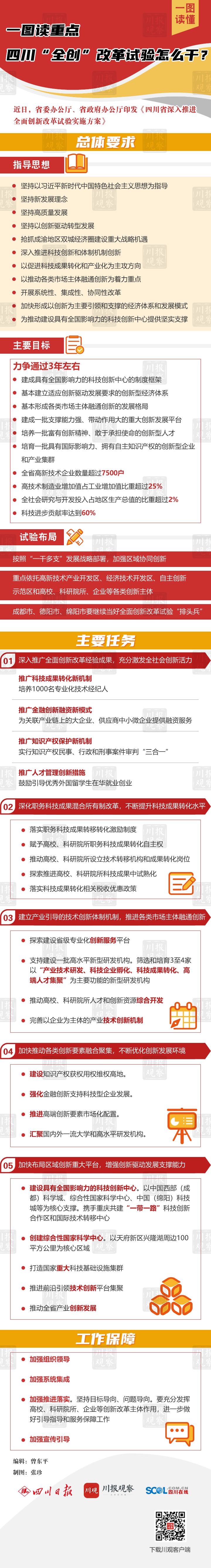 近日,省委办公厅、省政府办公厅印发《四川省深入推进全面创新改革试验实施方案》。四川“全创”改革试验怎么干?一图读重点。