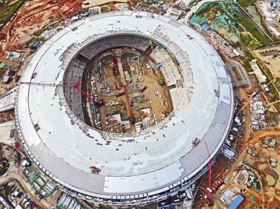 “飞碟”尚在打造中,但主体结构早就完成,远远望去,已是一个震撼夺目的大型地标。它已于8月初正式通电,正进行幕墙、精装修、景观提升等施工。从空中俯瞰,正圆形“飞碟”的屋顶上,巨大的太阳神鸟已经“展翅待飞”。