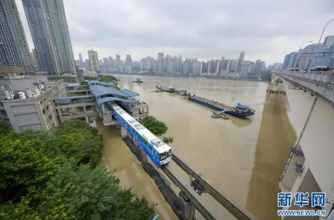 ▲8月19日,在重庆渝中区嘉陵江滨江路上,重庆轨道交通2号线正在运行,下面的路面已被洪水淹没。新华社记者 刘潺 摄