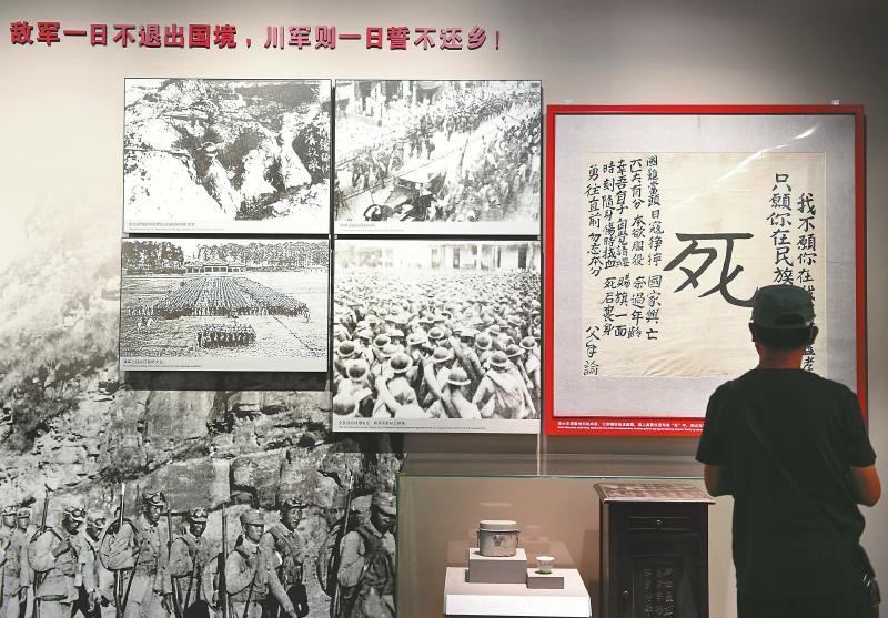 9月3日,北京,中国人民抗日战争纪念馆内,川军抗战誓言以及“死”字旗高挂墙上,吸引游客参观。这里有多份与川军和四川有关的抗战文物和展品。新华社记者张晨霖摄