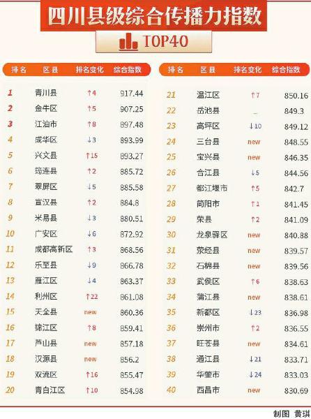 在新算法的应用下,本期综合传播力指数榜首迎来新面孔,广元市青川县名列第一;雅安市有6个县(市、区)新晋入围前40名;广元市利州区上升幅度最大。