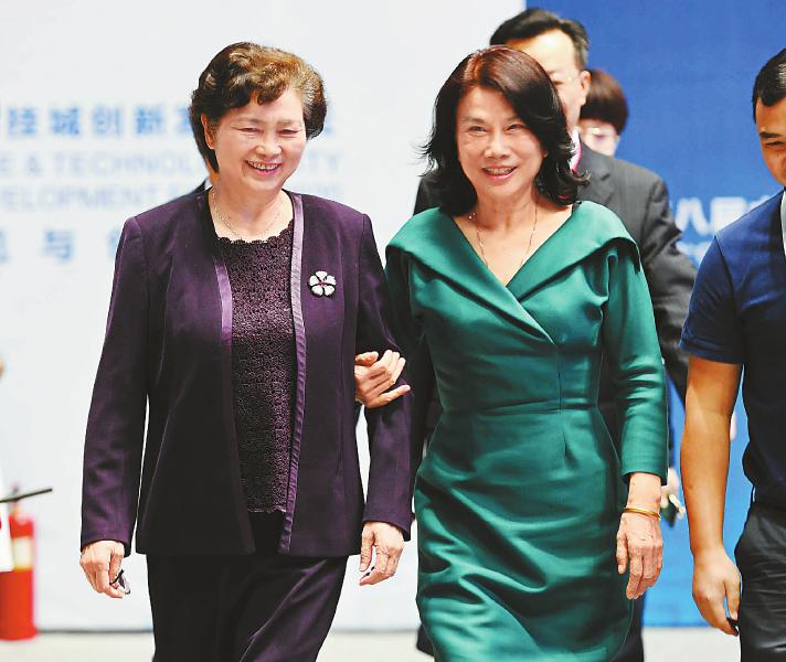 9月21日,格力电器股份有限公司董事长董明珠(右)手挽着中国工程院院士李兰娟(左)愉快交流。 四川日报全媒体记者肖雨杨摄