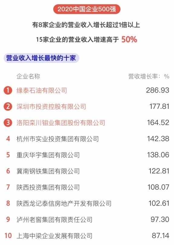 2020中国企业500强中,有8家企业的营业收入增长超过1倍以上,15家企业的营业收入增速高于50%。