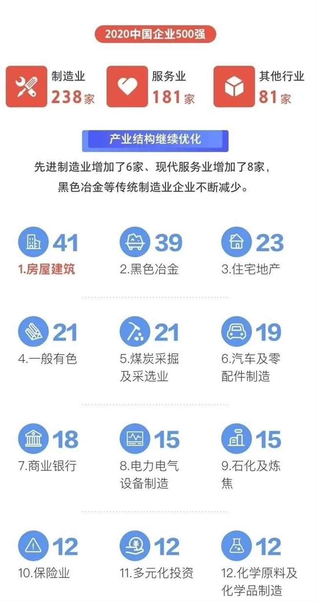 2020中国企业500强中,制造业238家,服务业181家,其他行业81家。