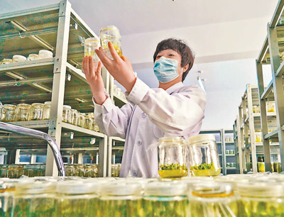 技术人员在张北县德胜村无菌育种室内察看马铃薯瓶苗长势。摄于2020年5月。新华社记者 牟 宇摄
