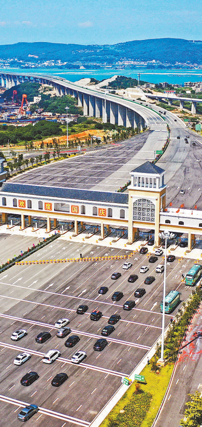 国庆假期,福建平潭海峡公铁两用大桥试通车。该桥是我国首座跨海公铁两用桥,上层为设计时速100公里的6车道高速公路,下层为设计时速200公里的双线I级铁路。图为试通车的平潭海峡公铁两用大桥。