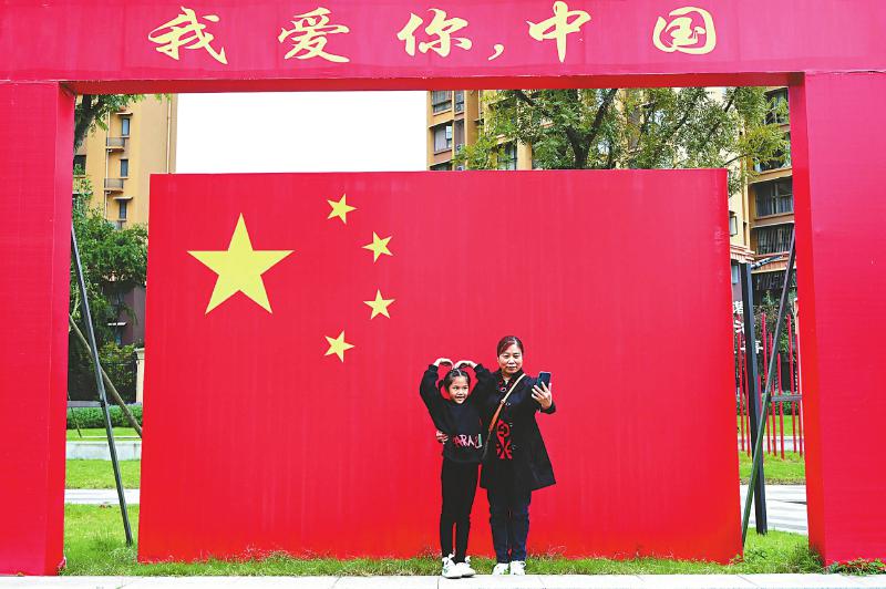 10月7日,德阳市旌阳区“社会主义核心价值观”主题公园内,“与国旗同框”的网红打卡点吸引不少市民驻足留影。