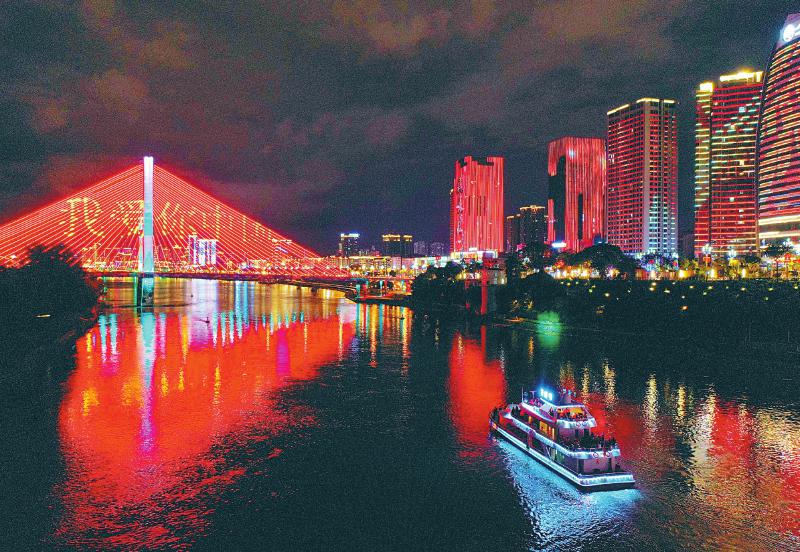 10月2日,南充市主城区华灯初上,璀璨霓虹、光彩夺目,跨江大桥上光影变幻,国庆灯光秀营造出了“双节”浓厚的氛围。