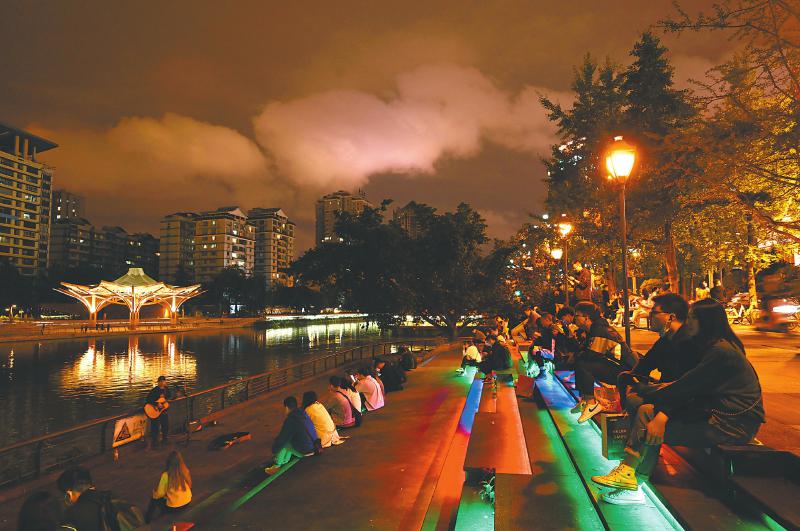 10月5日夜晚,成都街头艺人在合江亭弹唱,对岸璀璨的建筑是今年国庆刚刚改造亮灯的成都府南河音乐广场。