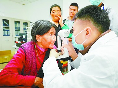 在“光明格桑花”活动中,对口援助工作组正在四川省甘孜州理塘县人民医院为当地群众开展白内障筛查。资料图片