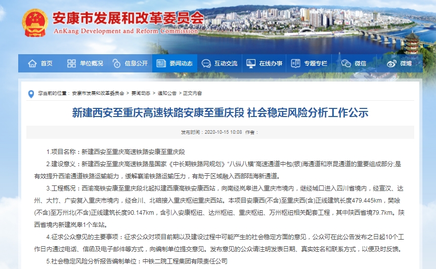 记者10月19日获悉,《新建西安至重庆高速铁路安康至重庆段 社会稳定风险分析工作公示》日前发布,这标志着西渝高铁安康至重庆段已进入可行性研究批复相关前置要件的编制和报批阶段,线路走向已基本确定。