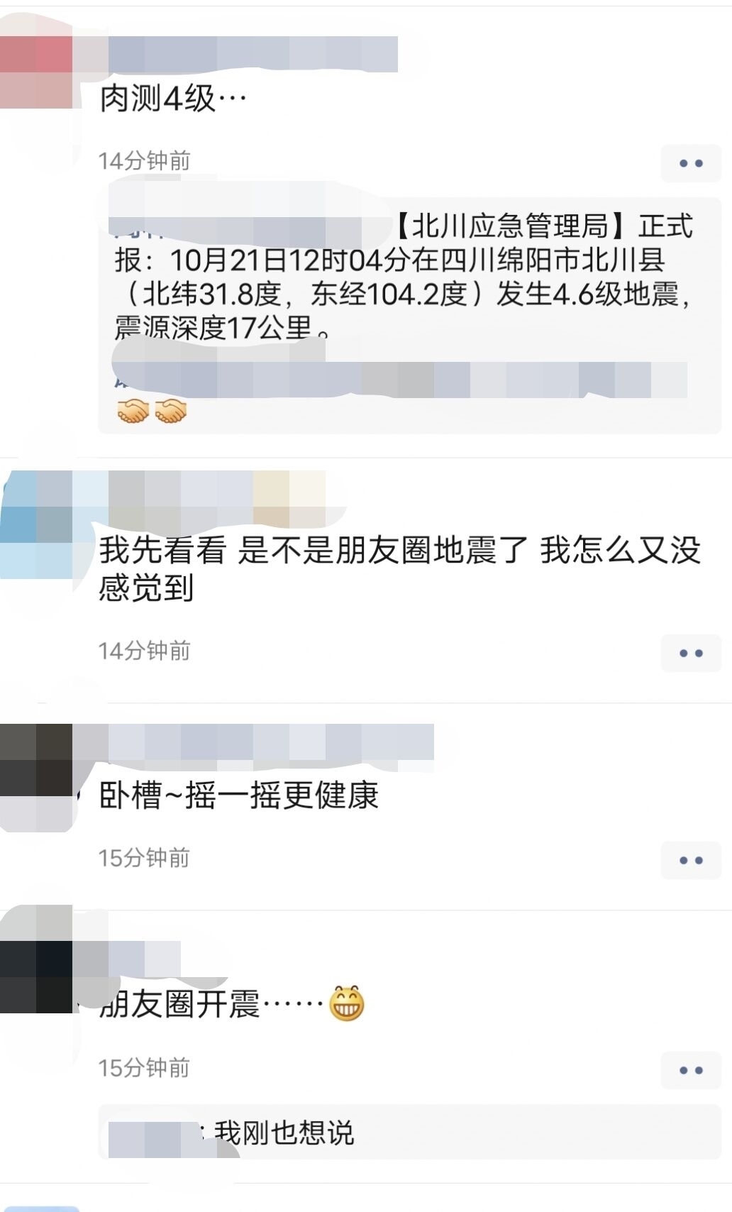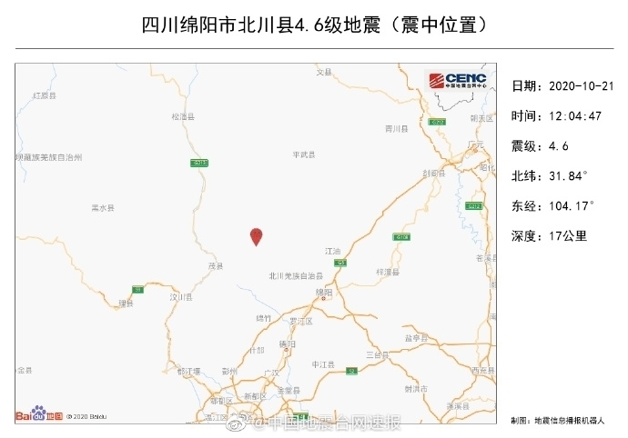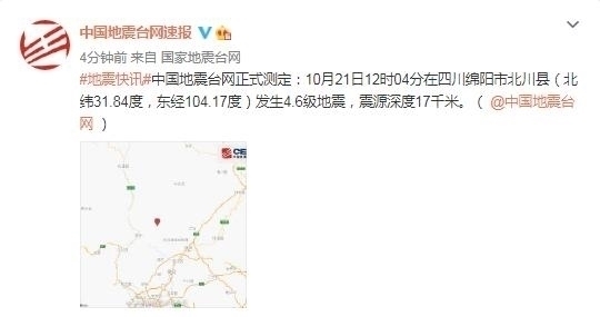据中国地震台网正式测定:10月21日12时04分在四川绵阳市北川县(北纬31.84度,东经104.17度)发生4.6级地震,震源深度17千米。震中距北川县14公里,距绵阳市64公里,距成都市133公里。