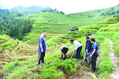 贵州省榕江县计划乡党委第一书记肖先钟(左三)与乡镇、村干部查看中药材天冬的产量。新华社发