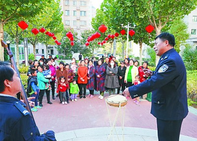 河北省迁安市公安局民警进社区以乐亭大鼓表演形式向群众宣传防电信诈骗知识。新华社发