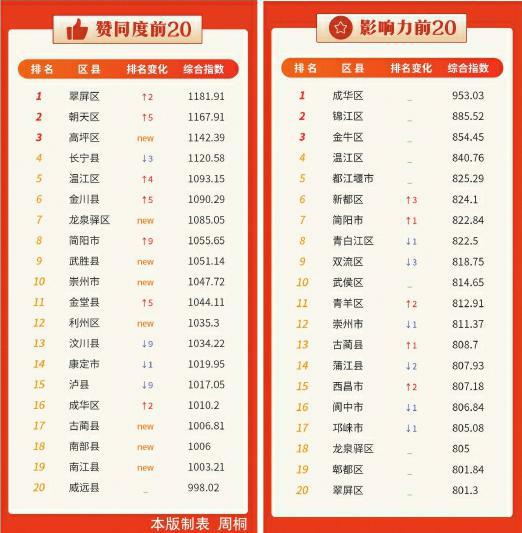 主要指标方面,影响力指数排名中,成都市新都区上升幅度最大;公开度指数排名中,成都市金牛区蝉联第一;赞同度指数排名中,宜宾市翠屏区居榜首,南充市高坪区新晋入围即取得第3名。